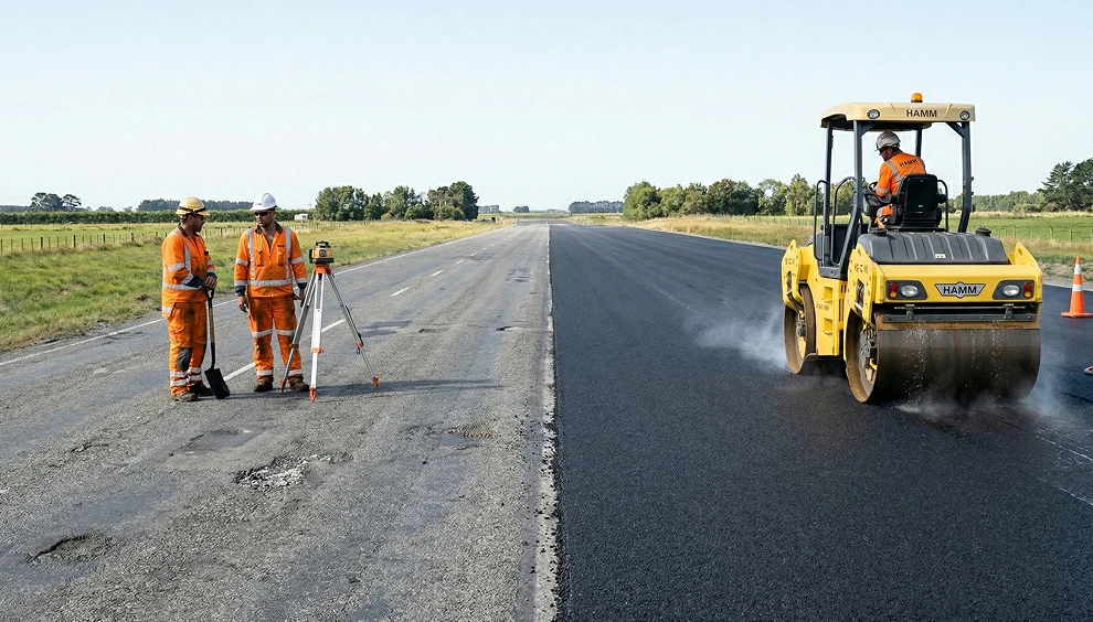 • Устройство асфальтобетонных покрытий — укладка нижнего и верхнего слоя асфальта с контролем плотности и толщины